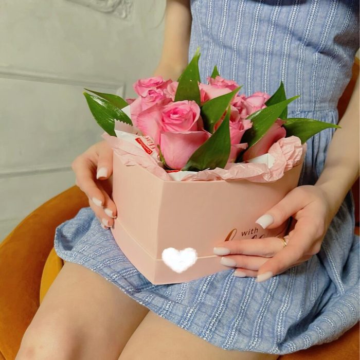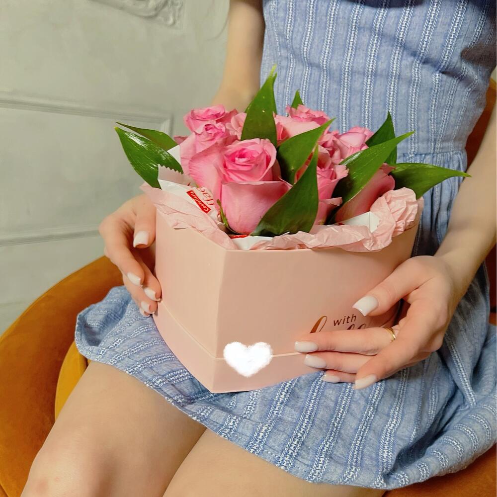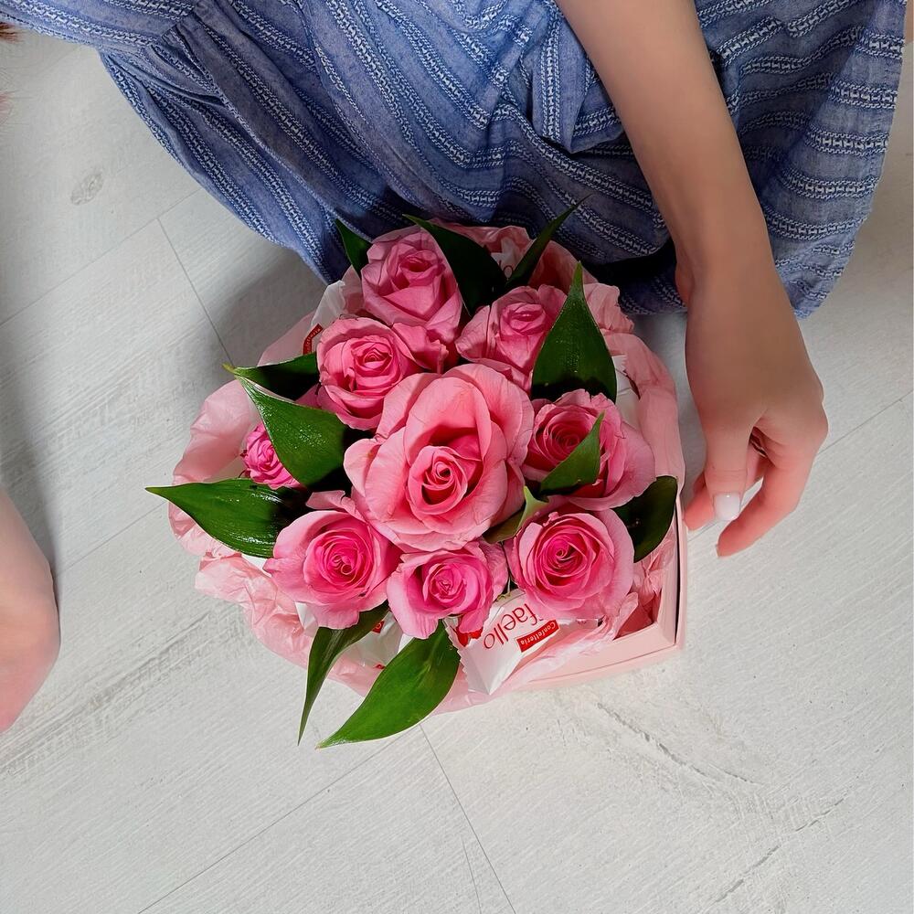 Роза – 9 шт.Рускус – 3 шт.Конфеты Raffaello – 8 шт.Тишью – 1 шт.Оазис флористический – 1 шт.Коробка сердце – 1 шт.