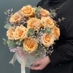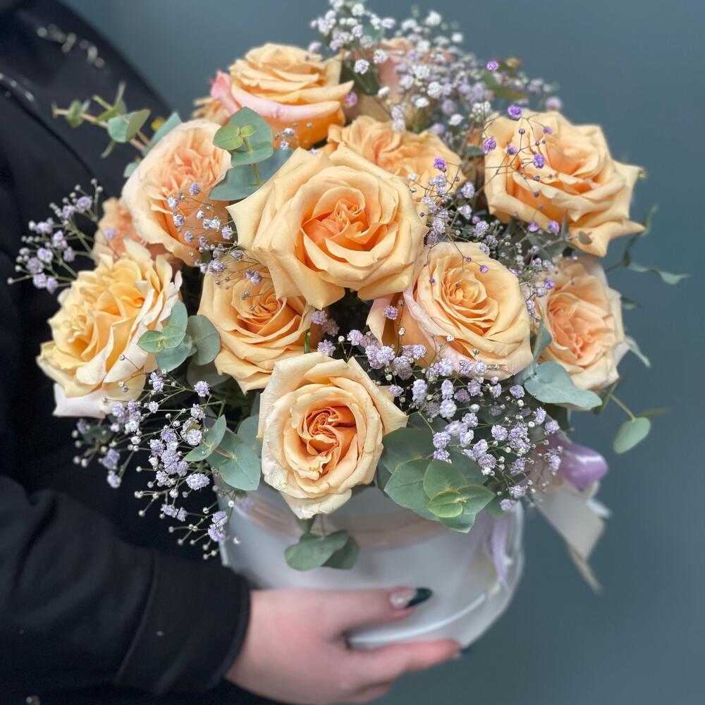 Гипсофила – 1 шт.Эвкалипт – 1 шт.Роза одноголовая – 15 шт.Коробка шляпная – 1 шт.Оазис флористический – 1 шт.