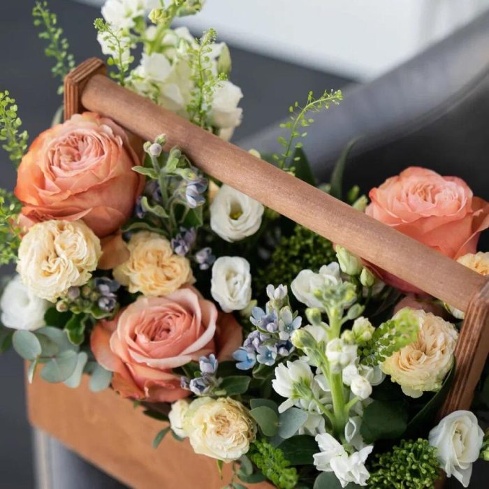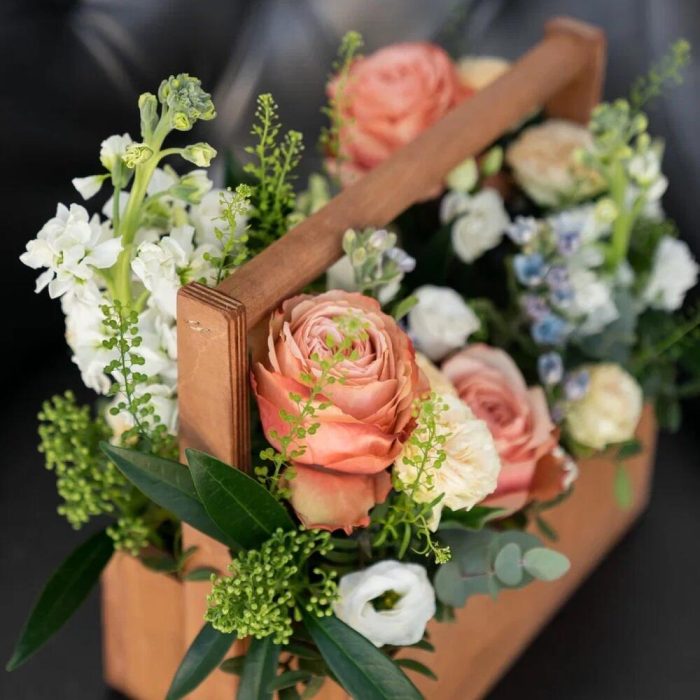 Композиция в ящике с садовыми розами «Волшебное утро»