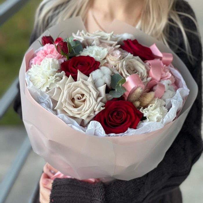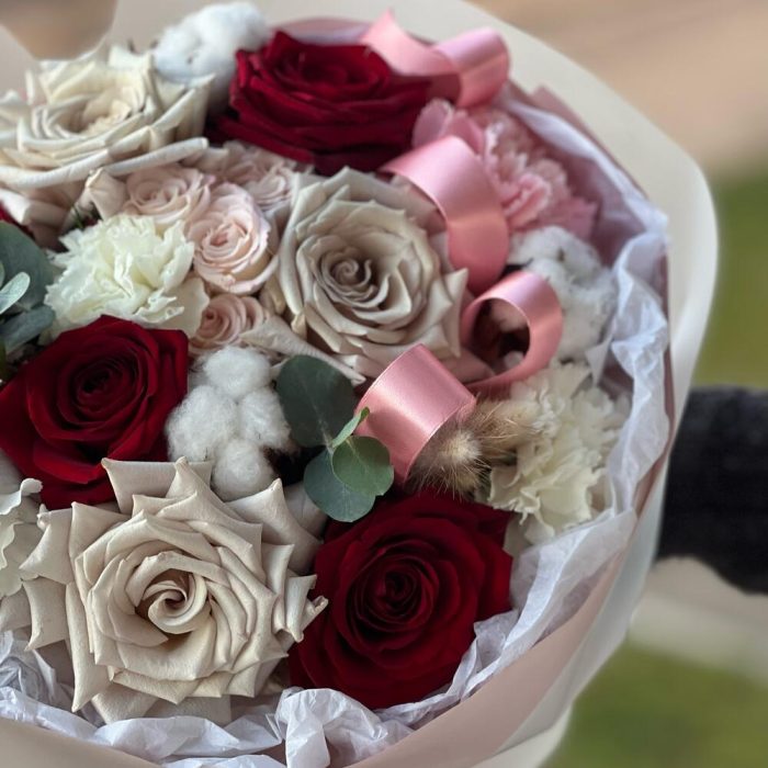 Роза красная – 3 шт.Роза кустовая – 1 шт.Эвкалипт – 1 шт.Роза пионовидная – 1 шт.Гвоздика сортовая – 5 шт.Упаковка дизайнерская – 1 шт.Кризал (подкормка) – 1 шт.Хлопок натуральный – 3 шт.Роза серая – 3 шт.Лагурус (сухоцвет) – 3 шт.