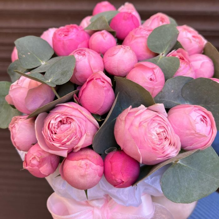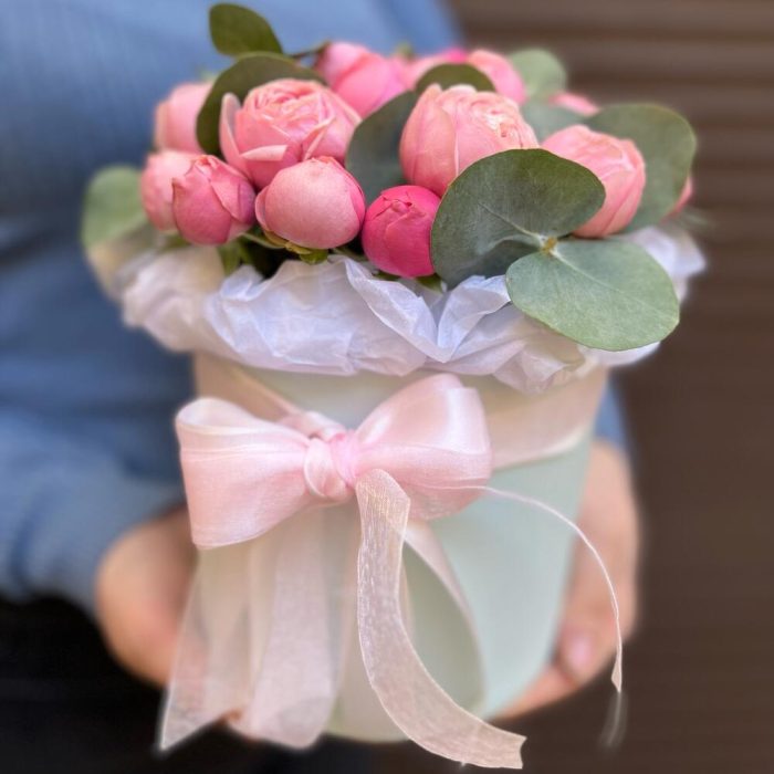 Эвкалипт – 5 шт.Лента атласная – 2 шт.Тишью – 1 шт.Оазис флористический – 1 шт.коробка шляпная s – 1 шт.сильва пинк кустовая роза – 5 шт.