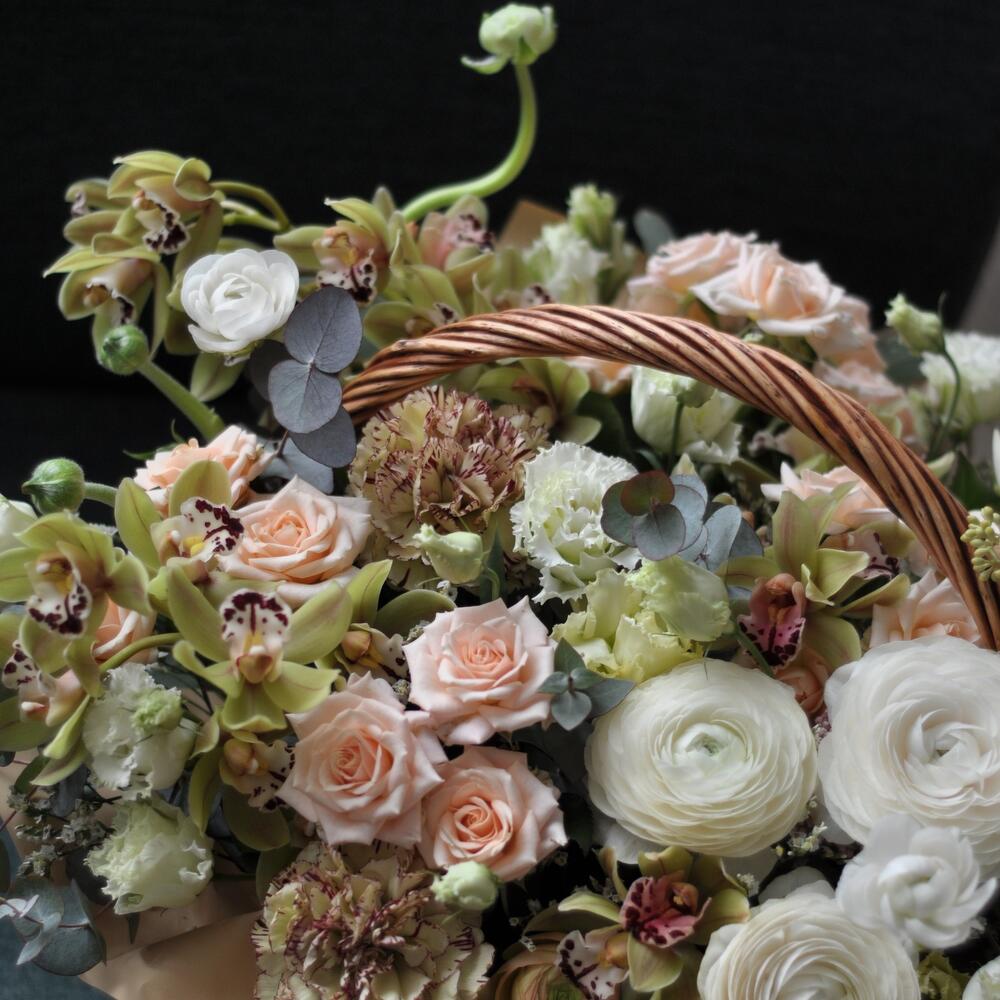 Кустовая роза – 5 шт.Ранункулюс (белый) – 4 шт.Орхидея Цимбидиум – 2 шт.Гвоздика – 3 шт.Эвкалипт – 3 шт.Сезонные цветы – 5 шт.сезонные ветки – 3 шт.Корзина – 1 шт.Флористическая губка – 2 шт.