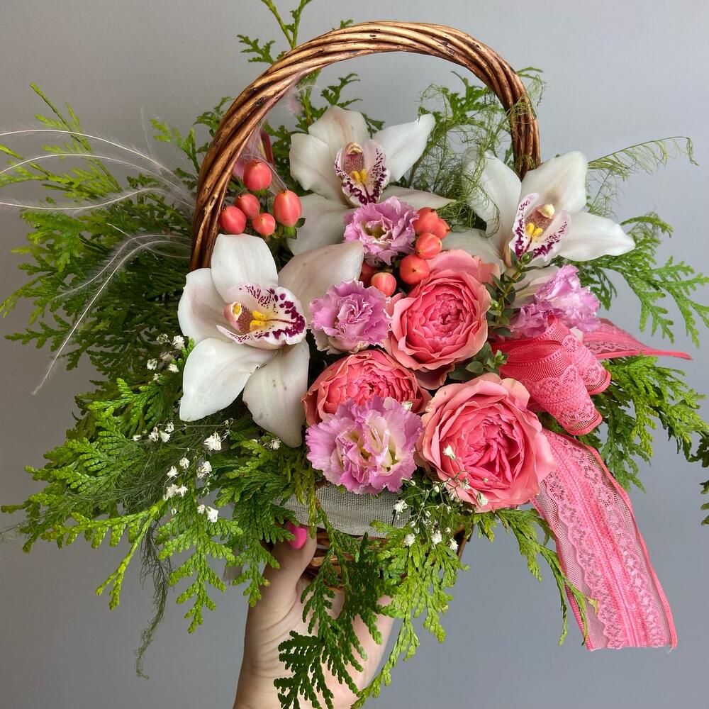 Гипсофила – 1 шт.орхидея – 3 шт.Лизиантус – 1 шт.Роза пионовидная – 3 шт.Корзина плетеная – 1 шт.Оазис флористический – 1 шт.декор бант – 1 шт.туя ветка – 1 шт.аспарагус пучок – 1 шт.Гиперикум – 2 шт.