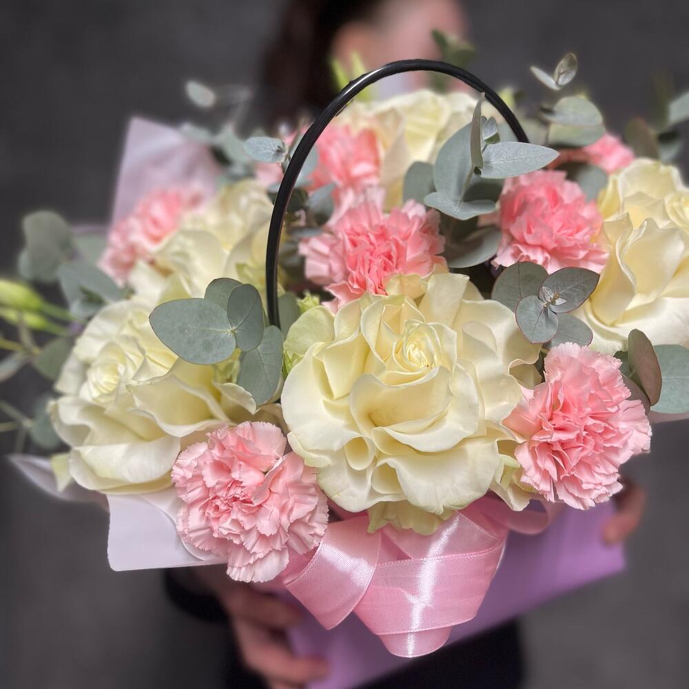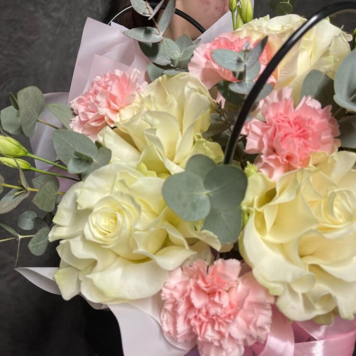 Лента – 2 шт.Эвкалипт – 7 шт.Диантус – 7 шт.Роза Мондиаль – 5 шт.Сумка – 1 шт.Оазис флористический – 1 шт.