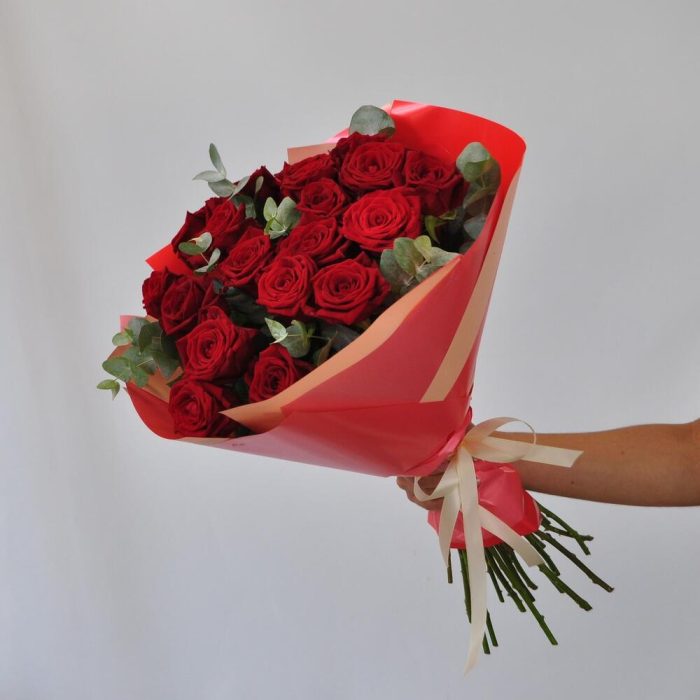 Красные розы с эвкалиптом, 19 штучек