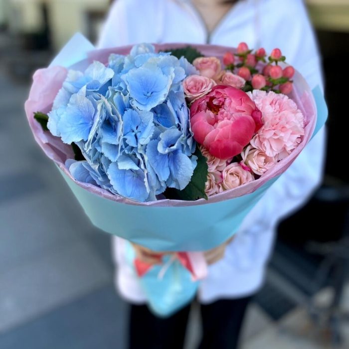 Гортензия – 1 шт.Озотамнус – 1 шт.Роза кустовая – 1 шт.Гвоздика – 3 шт.Пион коралл шарм – 1 шт.подкормка для срезанных цветов – 1 шт.инструкция по уходу за цветами – 1 шт.октрыточка с вашими пожеланиями – 1 шт.шоколадка – комплимент для получательницы – 1 шт.