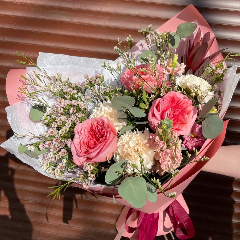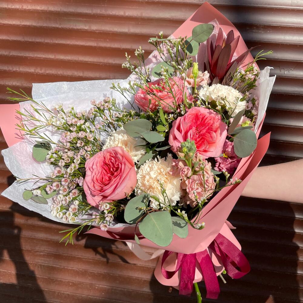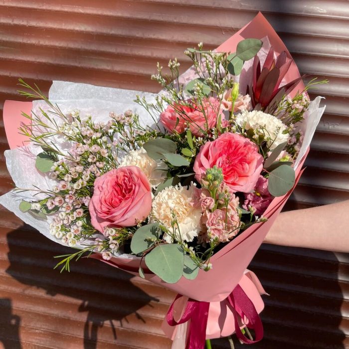 Ваксфлауэр – 3 шт.Лимониум – 2 шт.Маттиола – 1 шт.Эвкалипт – 2 шт.Эустома – 3 шт.Лента атласная – 2 шт.Диантус – 3 шт.Фисташка – 1 шт.Роза пионовидная – 3 шт.Сафари – 1 шт.Упаковка дизайнерская – 2 шт.