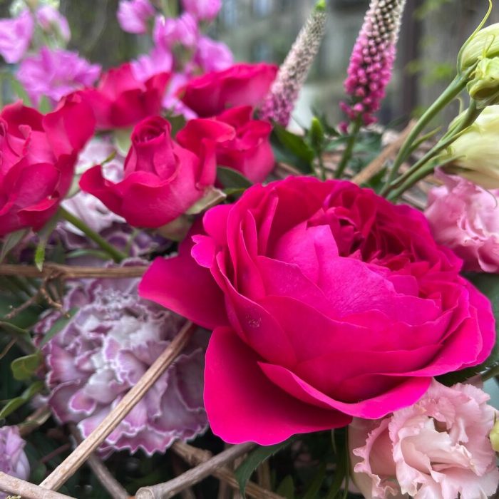 Роза пионовидная дэвида остина – 3 шт.Маттиола – 3 шт.Бруния – 3 шт.Сантини – 3 шт.Вероника – 3 шт.Роза кустовая – 2 шт.Диантус – 6 шт.ветки декоративные – 10 шт.Фисташка – 15 шт.Лента атласная – 2 шт.