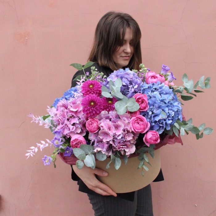 Георгина – 3 шт.Гортензия – 5 шт.Маттиола – 10 шт.Роза пионовидная кустовая – 5 шт.рускус стабилизированный – 2 шт.Эвкалипт – 10 шт.Тишью – 2 шт.Шляпная коробка – 1 шт.Оазис флористический – 2 шт.