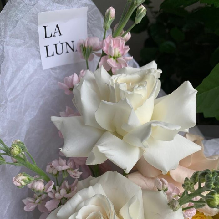 Маттиола фиолетовая – 3 шт.роза playa blanca – 3 шт.роза quicksand – 2 шт.роза sunny trendsetter – 2 шт.Фрезия белая – 2 шт.Озотамнус – 1 шт.хризантема coconut – 1 шт.гвоздика белая сортовая – 3 шт.Форзиция – 2 шт.Упаковка дизайнерская – 1 шт.Лента атласная – 1 шт.инструкция по уходу за цветами – 1 шт.Кризал (подкормка) – 1 шт.Транспортировочная коробка – 1 шт.Аквапак – 1 шт.
