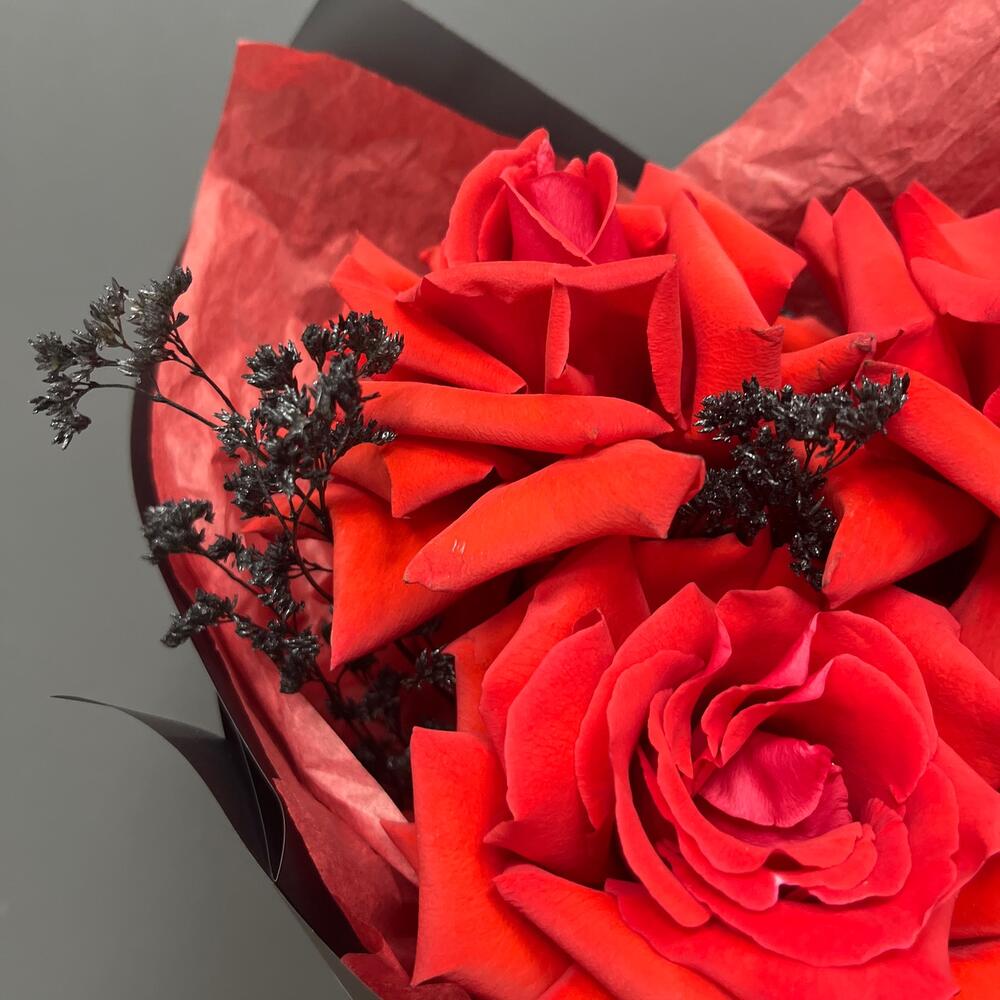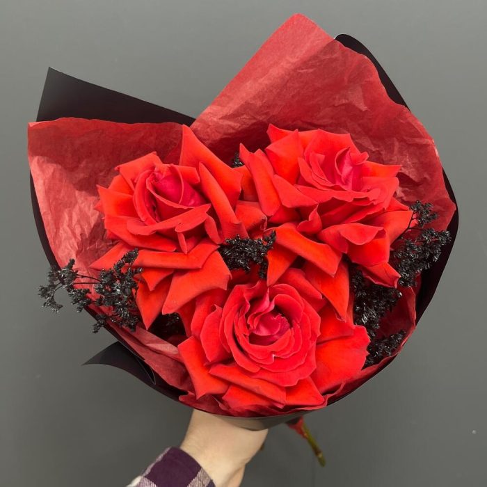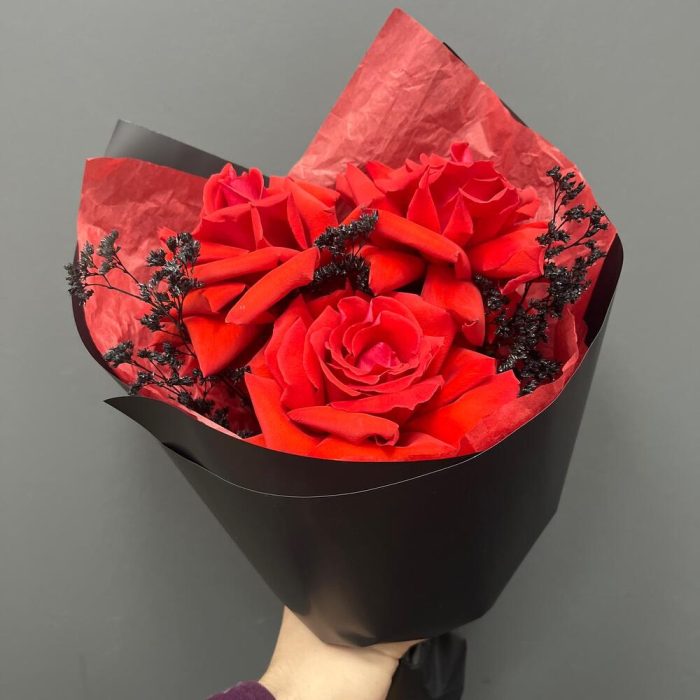 Лента атласная – 1 шт.Тишью – 1 шт.Упаковка корейская пленка – 1 шт.сухоцвет крашенный – 1 шт.роза французская алая нина – 3 шт.