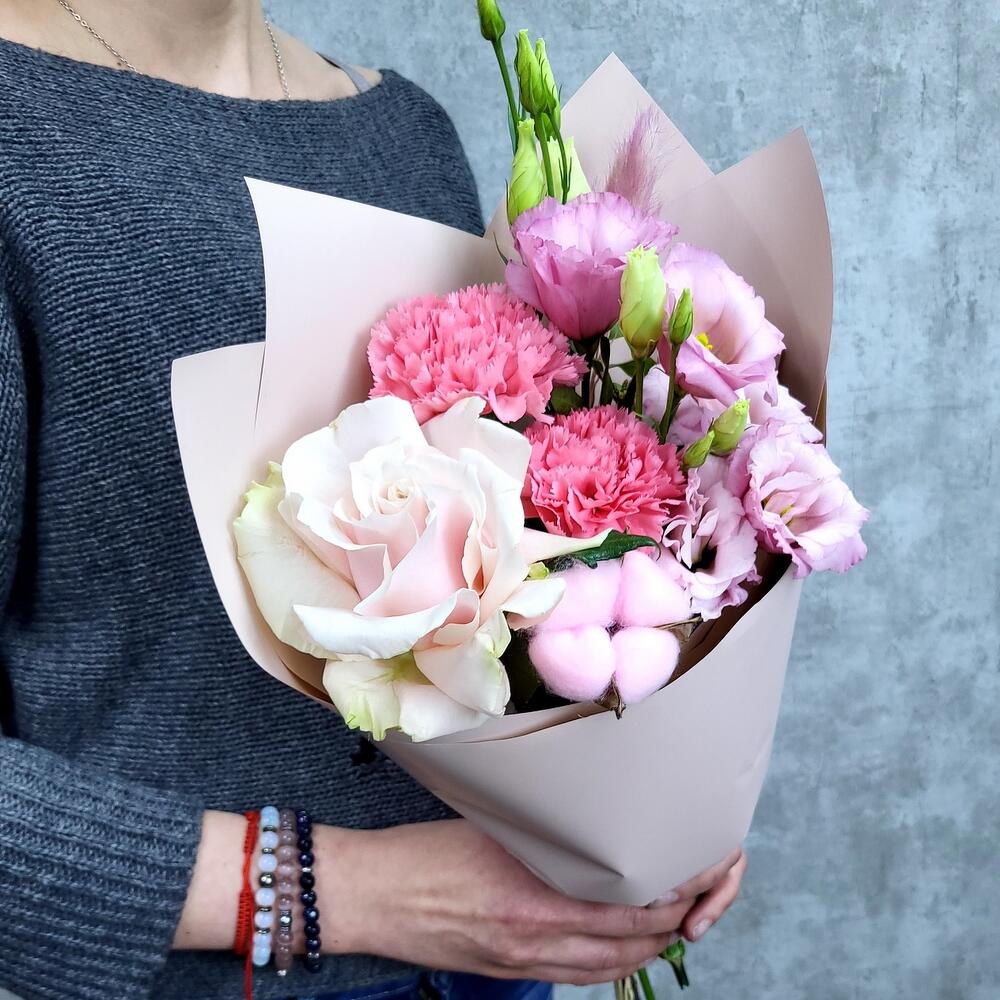 Лизиантус – 1 шт.Роза Эквадор – 1 шт.Гвоздика – 3 шт.Упаковка дизайнерская – 1 шт.