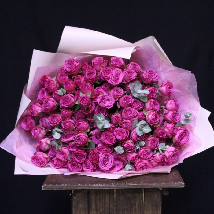 роза кустовая пионовидная классик сенсейшн – 25 шт.Эвкалипт – 5 шт.Пленка дизайнерская – 3 шт.Лента атласная – 1 шт.