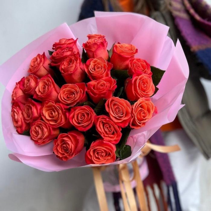 Моно букет из оранжевых роз ,25 шт в фирменной упаковке