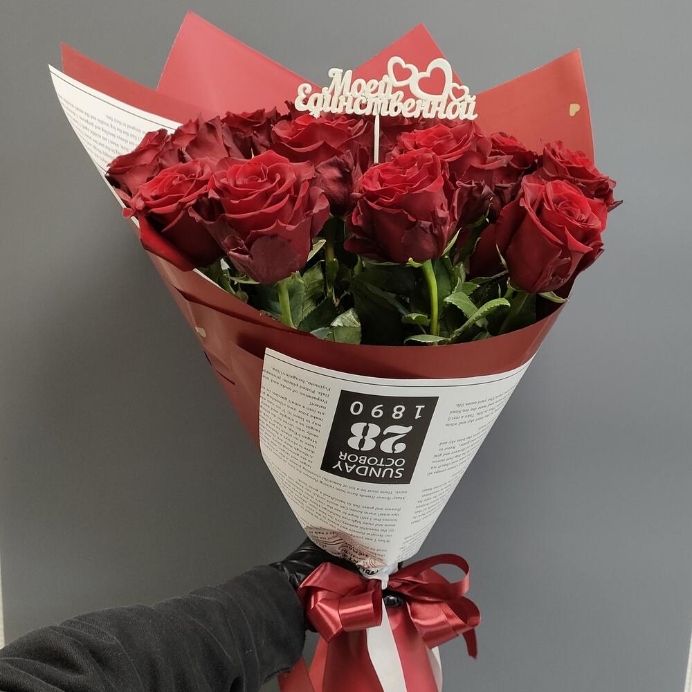 Роза Эквадор Красная – 15 шт.Пленка – 1 шт.Топпер – 1 шт.