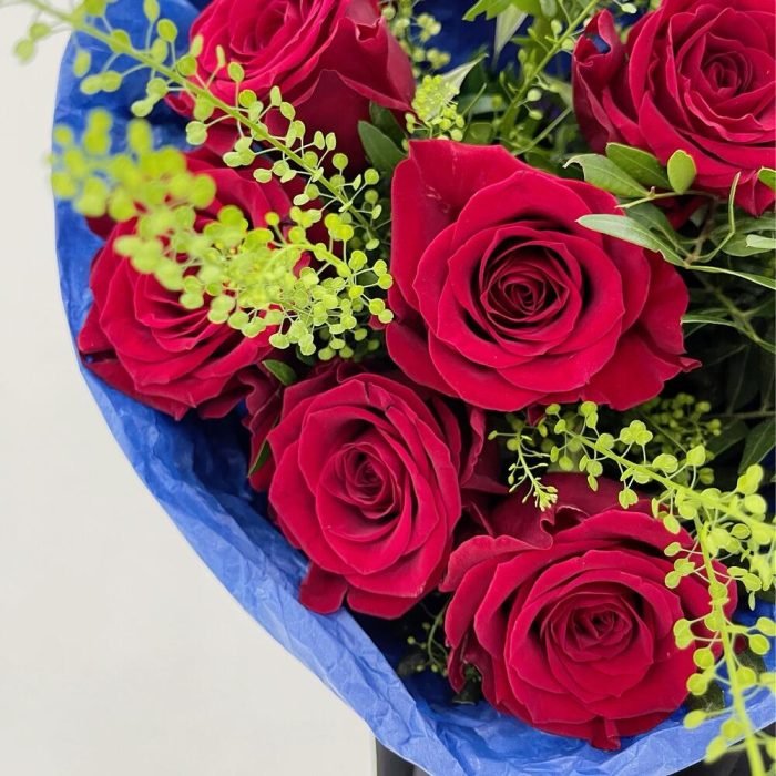 Роза красная премиум – 9 шт.Гринбелл – 5 шт.Фисташка пучок – 1 шт.Тишью – 1 шт.Упаковка матовая – 1 шт.Лента – 1 шт.