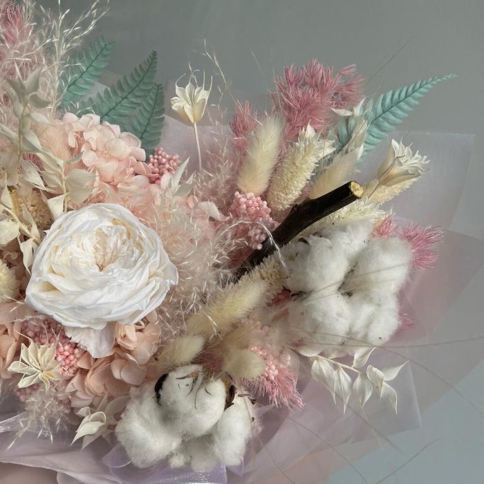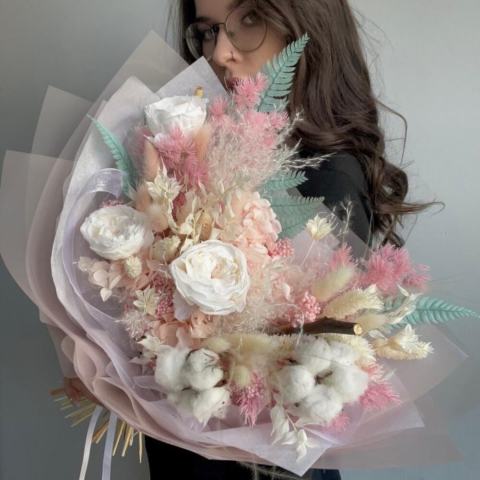 Гортензия – 1 шт.Озотамнус – 2 шт.Папоротник – 1 шт.Рускус – 2 шт.Хлопок – 2 шт.Аспарагус – 1 шт.Упаковка дизайнерская – 1 шт.Роза стабилизированная – 3 шт.Ковыль – 3 шт.Нигелла – 1 шт.Лагурус – 12 шт.Мак – 2 шт.Фаларис – 8 шт.пампасная трава – 1 шт.