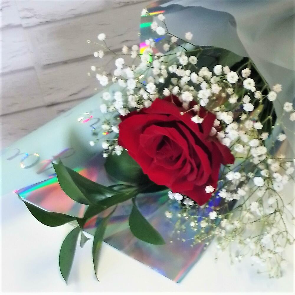 Роза – 1 шт.Гипсофила – 1 шт.Рускус Израиль – 1 шт.пленка флористическая – 2 шт.Лента атласная – 1 шт.
