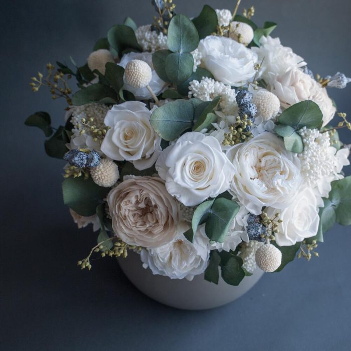 Роза стабилизированная – 15 шт.Эвкалипт стабилизированный – 16 шт.гортензия стабилизированная – 1 шт.озотамнус стабилизированный – 1 шт.эвкалипт плоды – 9 шт.