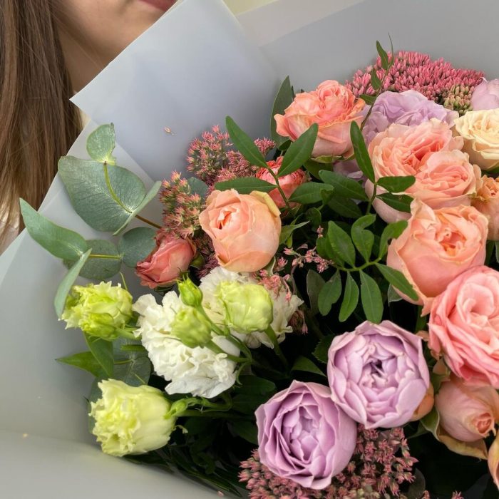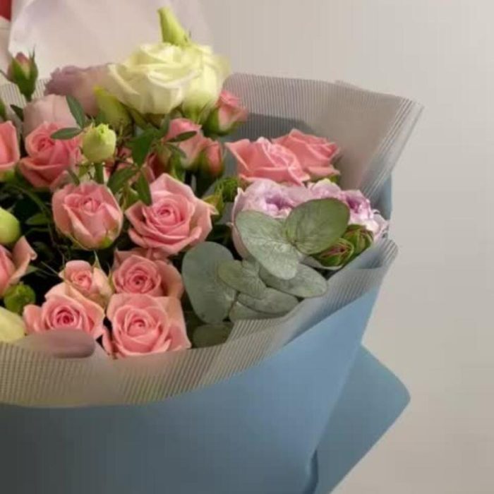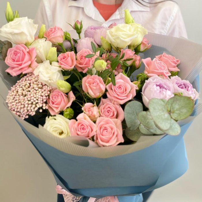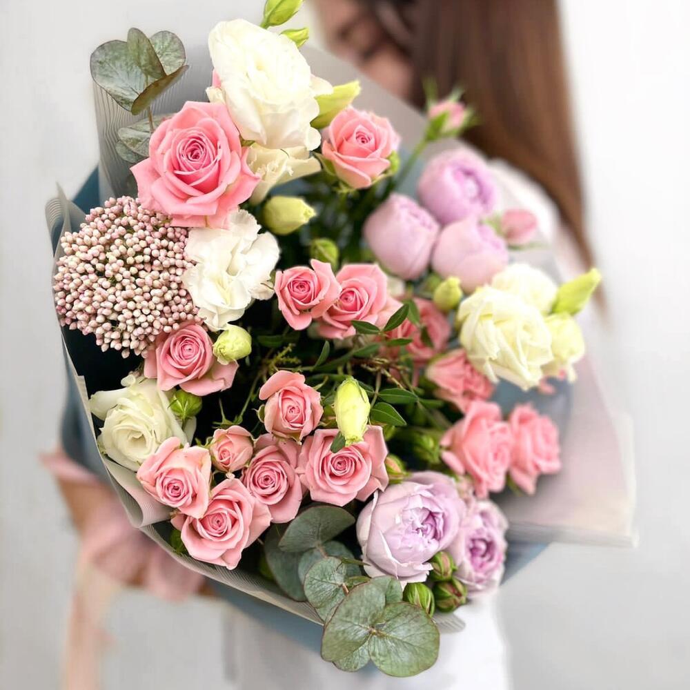 Кустовая роза – 2 шт.Эустома – 2 шт.Фисташка – 1 шт.Упаковка дизайнерская – 2 шт.Райсфлауэр – 1 шт.Эвкалипт Baby Blue – 1 шт.Кустовая роза пионовидная – 3 шт.