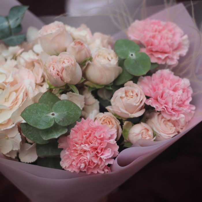 Рускус – 5 шт.Эвкалипт – 4 шт.Лента атласная – 1 шт.Кустовая роза Бомбастик – 2 шт.Гортензия розовая – 1 шт.Диантус розовый – 3 шт.Дизайнерская упаковка – 5 шт.стифа натуральная – 1 шт.