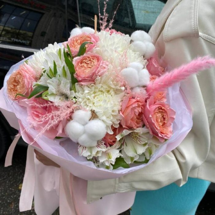 Хризантема – 3 шт.Роза Джульетта – 4 шт.Хлопок – 5 шт.Альстромерия – 2 шт.камыш – 1 шт.Упаковка – 4 шт.
