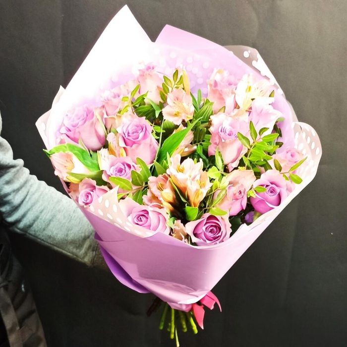 Роза Кенийская – 15 шт.Альстромерия – 3 шт.Фисташка – 5 шт.Упаковка дизайнерская – 2 шт.