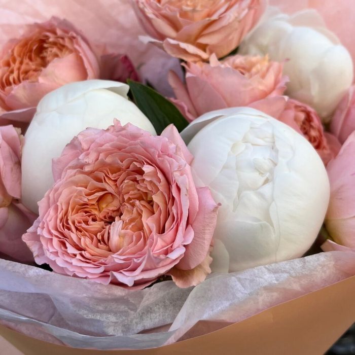 Пион белый – 3 шт.тишью белоснежное – 1 шт.упаковка корейская пленка персиковая – 1 шт.премиум пионовидных роза джульетта – 4 шт.