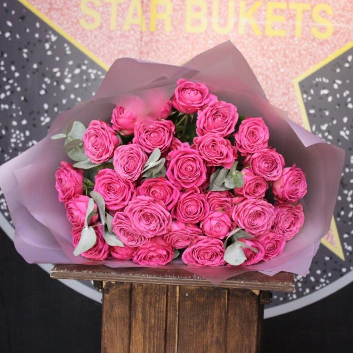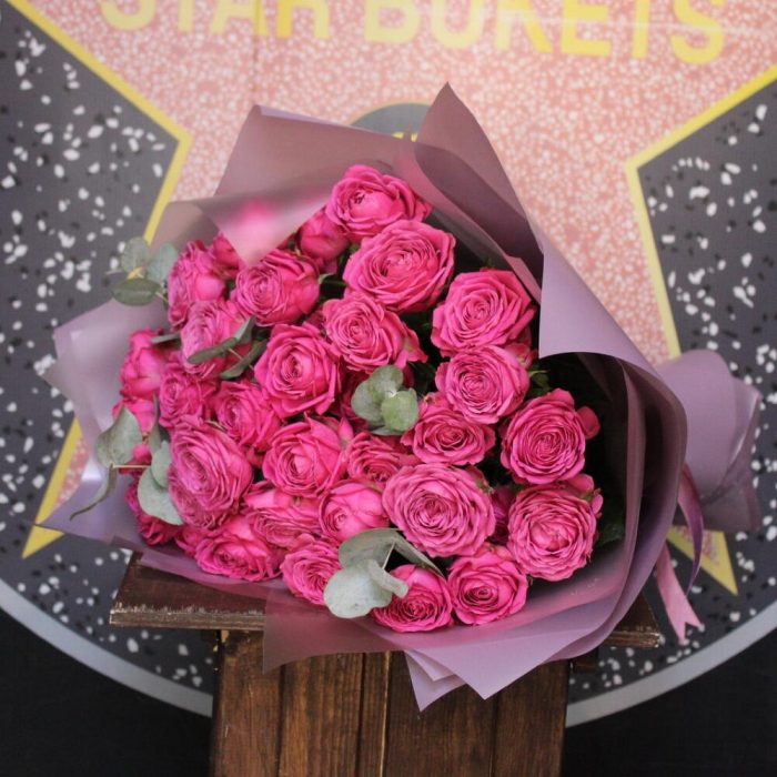 роза кустовая пионовидная классик сенсейшн – 9 шт.Эвкалипт – 3 шт.Пленка дизайнерская – 4 шт.Лента атласная – 1 шт.