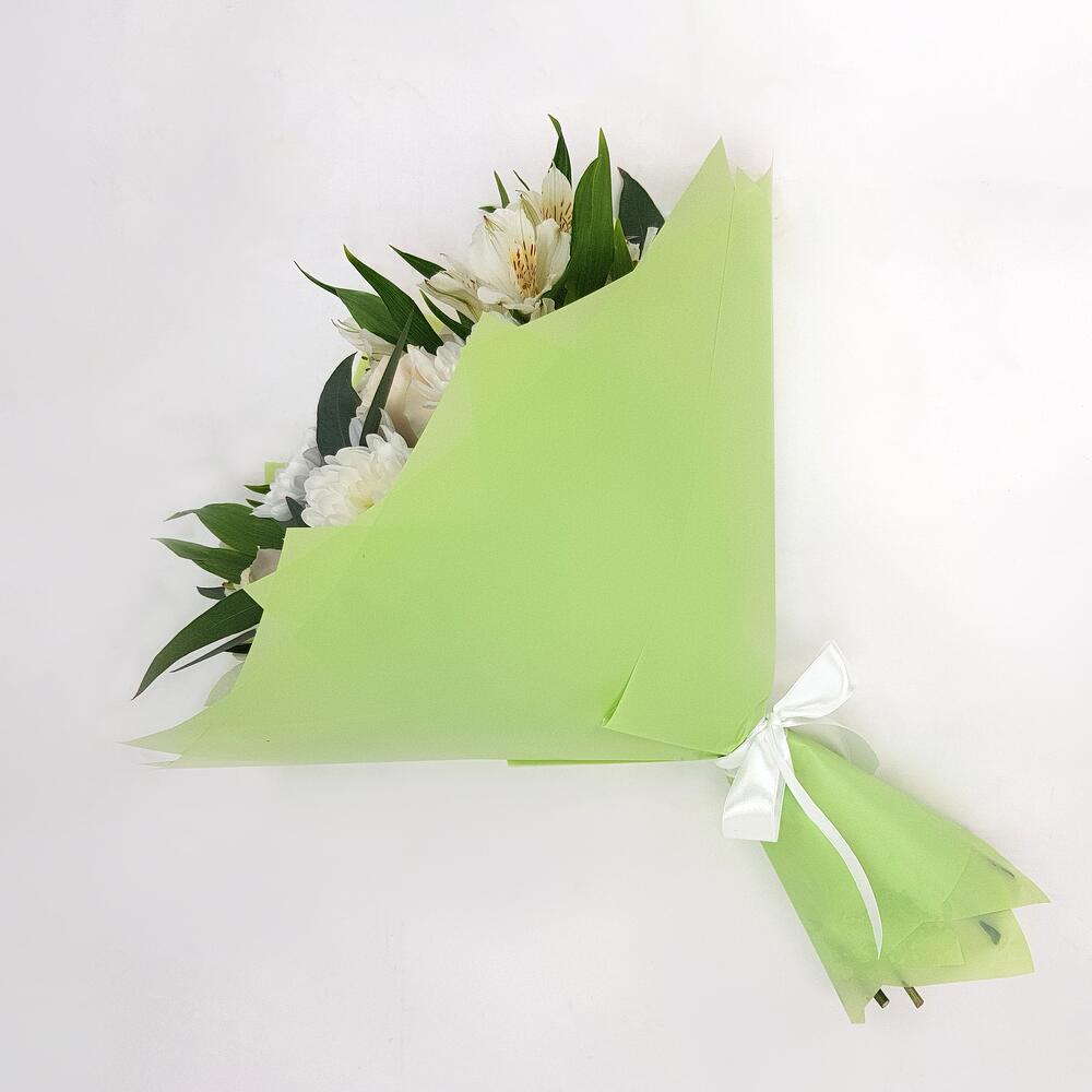 Роза одноголовая – 5 шт.Эвкалипт – 3 шт.Альстромерия – 3 шт.Хризантема Балтика – 3 шт.Упаковка – 1 шт.