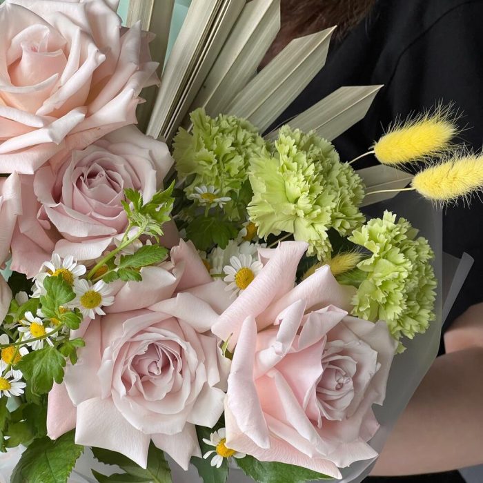роза sweet escimo премиум – 5 шт.гвоздика lime – 3 шт.Матрикария – 1 шт.пальма веерная сухоцвет – 1 шт.Лагурус – 3 шт.Дизайнерская упаковка – 1 шт.Лента – 1 шт.