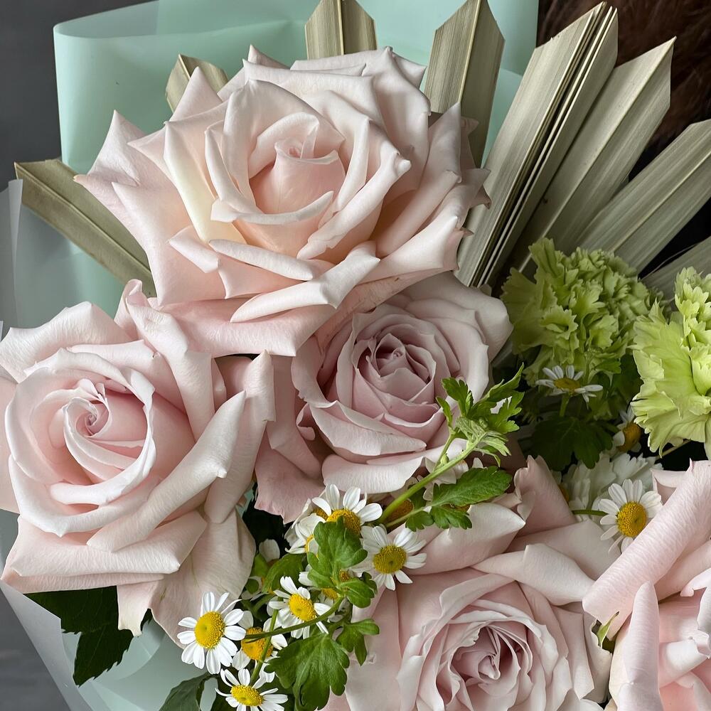 Стильный букет в крутейшем сочетании нежно розового и салатового. Каждая роза раскрыта вручную по специальной технике для большего «Вау!» эффекта.Не забудьте подрезать цветы перед тем как ставить в воду. Не храните букет на прямых солнечных лучах и возле отопительных … Показать ещёприборов, чтобы сохранить цветы как можно дольше.