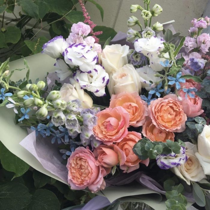 Букет с пионовидными розами, дельфиниумом, твидией, лизиантусом, маттиолой, астильбой и эвкалиптом.