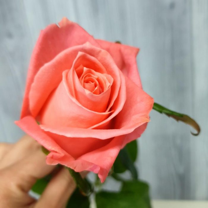 Нежно кораловая, стойкая из стойких. С плотным, классическим бутоном. С яркой и крупной листвой, что позволяет собрать букет без упаковки, просто под ленту в цвет розы. Смотрится шикарно и достойно. Витамины для стойкости цветка в подарок. Дарите с удовольствием)))