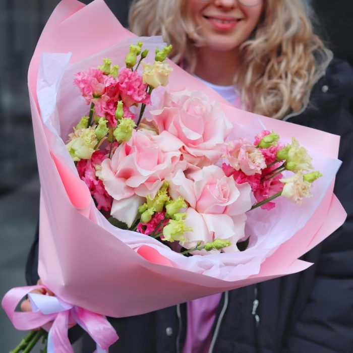 Розовый букет-комплимент с французскими розами и лизиантусом