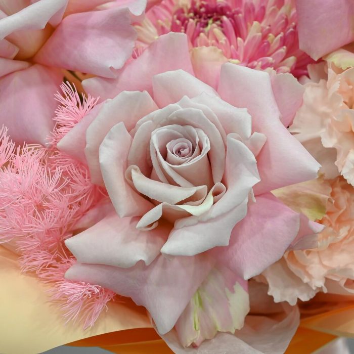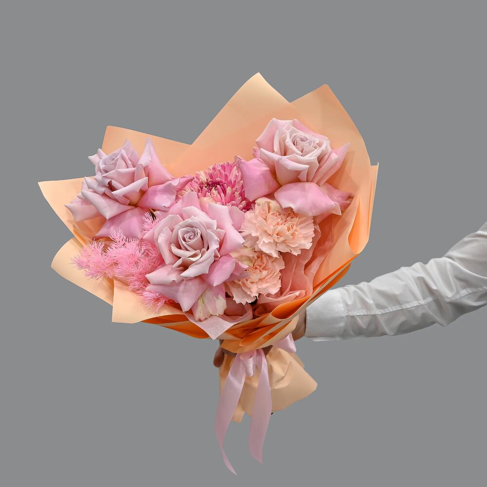 Нежный букет в бело розовой цветовой гамме. В составе французские розы, сортовая гвоздика и хризантема.Флористы студии Цветочный Этикет собрали его из самых свежих цветов, тщательно продумав состав. Букет готов удивлять красотой своего получателя! Станет идеальным подарком … Показать ещёдля любимой женщины, дочке или мамы, на День Рождения, юбилей, свадьбу и другие торжественные мероприятия. С букетом вы получите конверт с открыткой, в которой мы напишем любое пожелание, инструкцию свежести и средство для продления жизни срезанных цветов.