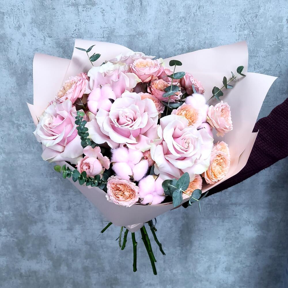 Гвоздики, Кустовые розы, Пионовидные розы, Розы
