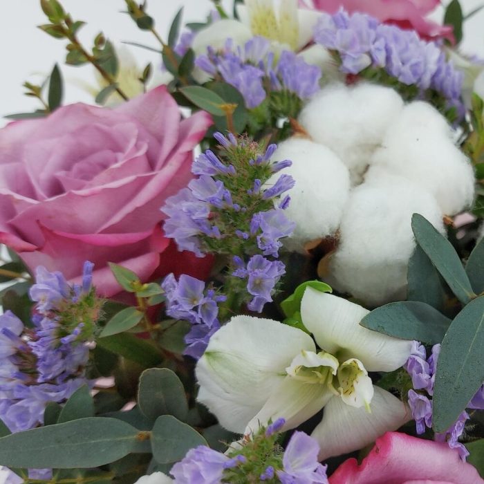 Роза одноголовая – 5 шт.Альстромерия – 3 шт.Хлопок натуральный – 2 шт.Статица лавандовая – 3 шт.Эвкалипт – 4 шт.Коробка цилиндр – 1 шт.Пленка матовая – 1 шт.Лента атласная – 1 шт.Флористическая губка (оазис) – 1 шт.