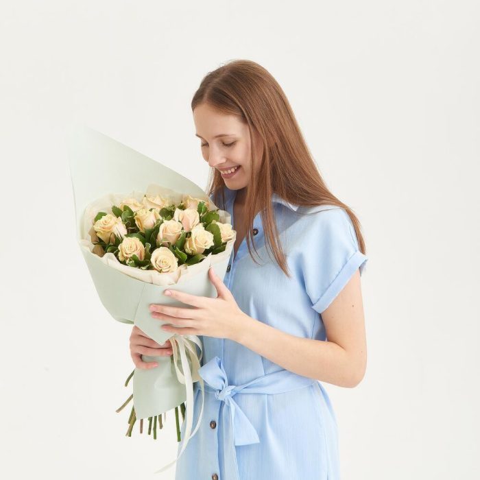 розы талея – 11 шт. Зелень – 5 шт. Открыточка с вашими пожеланиями – 1 шт. Упаковка дизайнерская – 2 шт.