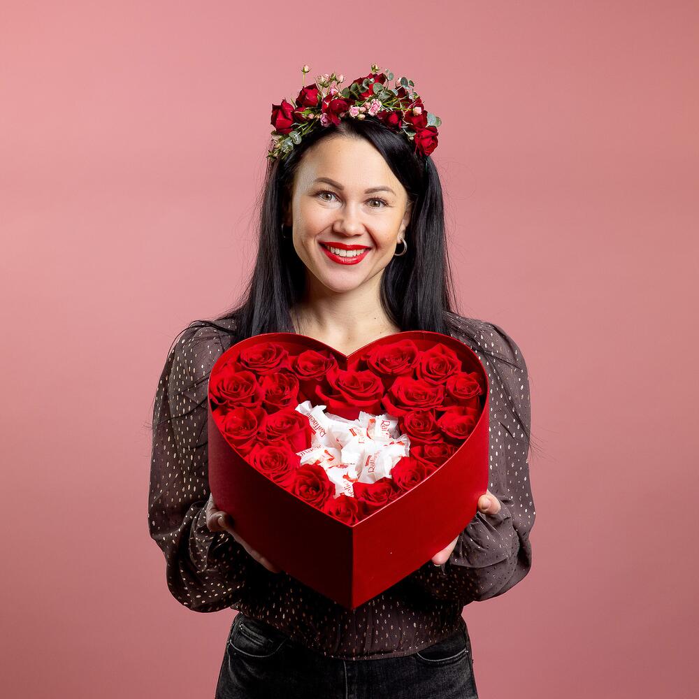 Сердце из 25 красных роз с конфетами