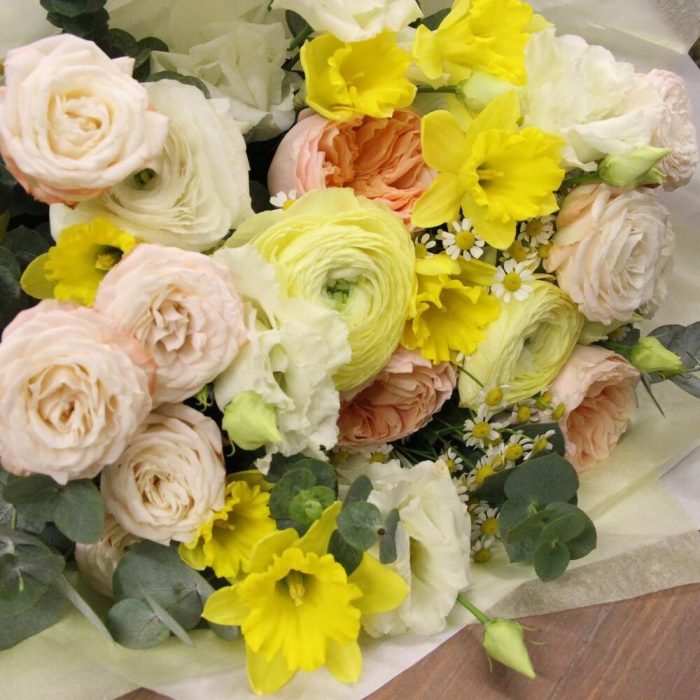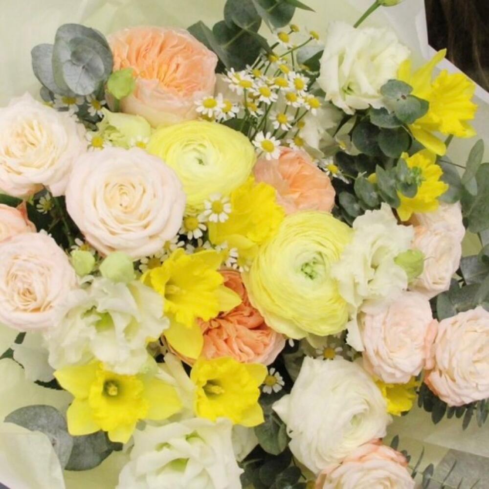Нарцисс – 7 шт.Ранункулюс – 3 шт.Ромашка – 3 шт.Роза кустовая пионовидная – 3 шт.Роза пионовидная – 3 шт.Лизиантус – 5 шт.эваклипт – 3 шт.Упаковка – 1 шт.