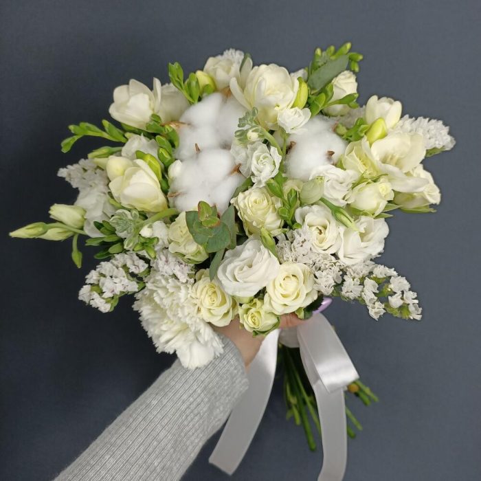 Хлопок – 3 шт.Фрезия – 10 шт.Роза кустовая – 5 шт.Лизиантус – 3 шт.Статица – 2 шт.Гвоздика – 1 шт.Эвкалипт – 1 шт.Лента атласная – 3 шт.