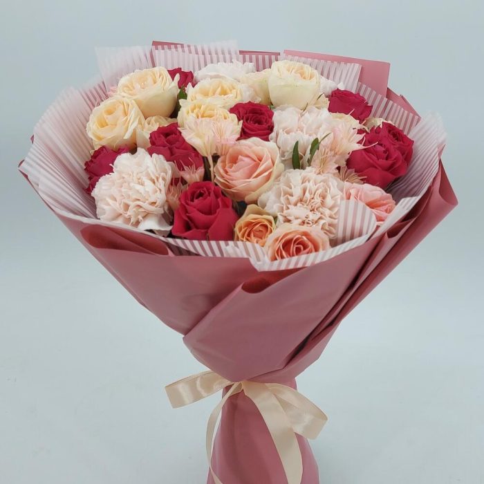 Роза одноголовая – 9 шт.Диантус – 6 шт.Упаковка дизайнерская – 1 шт.Пистация – 3 шт.роза кустовая премиум – 4 шт.