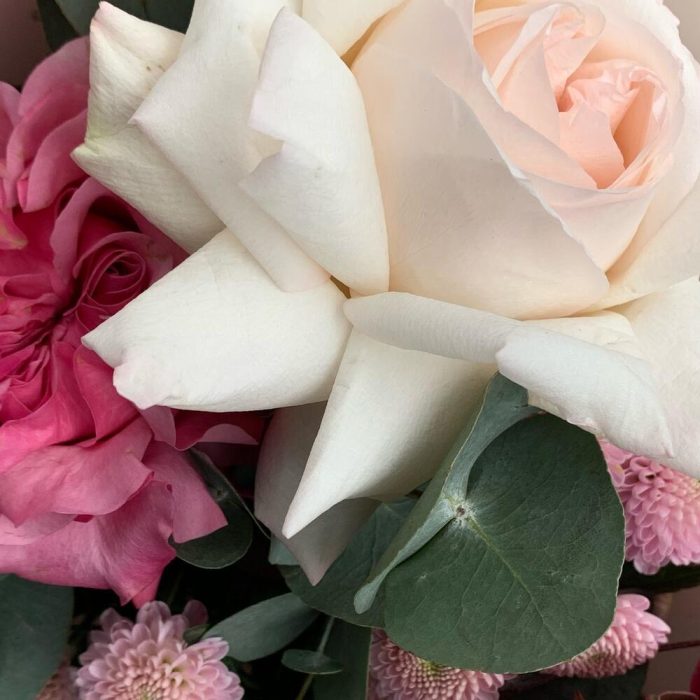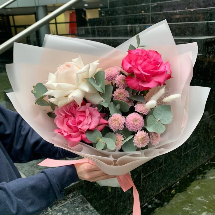 роза кантри блю – 2 шт.роза вайт о хара( ароматная) – 1 шт.сантиния кустовая – 2 шт.Эвкалипт – 1 шт.Упаковка дизайнерская – 1 шт.