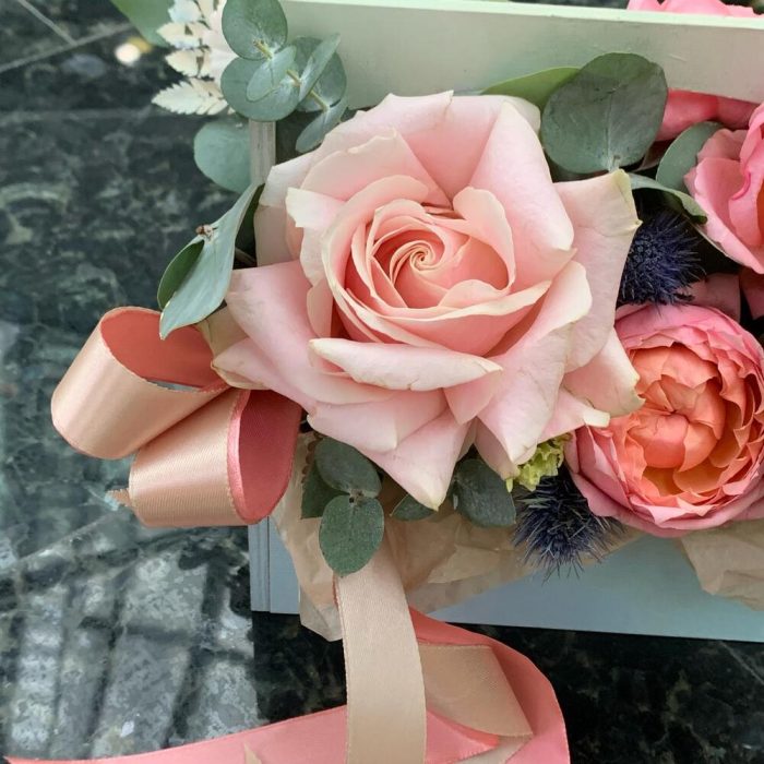 “Атлас☁️” – цветочная композиция с зефиром в деревянном ящике