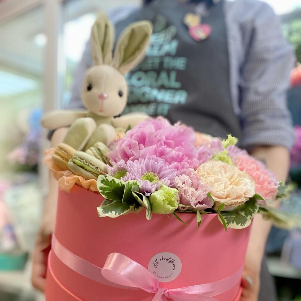 Хризантема кустовая – 2 шт.Коробка шляпная – 1 шт.Роза кустовая пионовидная – 2 шт.Пирожные макарон – 3 шт.Диантус сортовой – 3 шт.Пион импортный – 1 шт.Эустома алиса – 2 шт.Губка флористическая – 1 шт.зелень декоративная – 1 шт.зайка плюшевый 20 см – 1 шт.