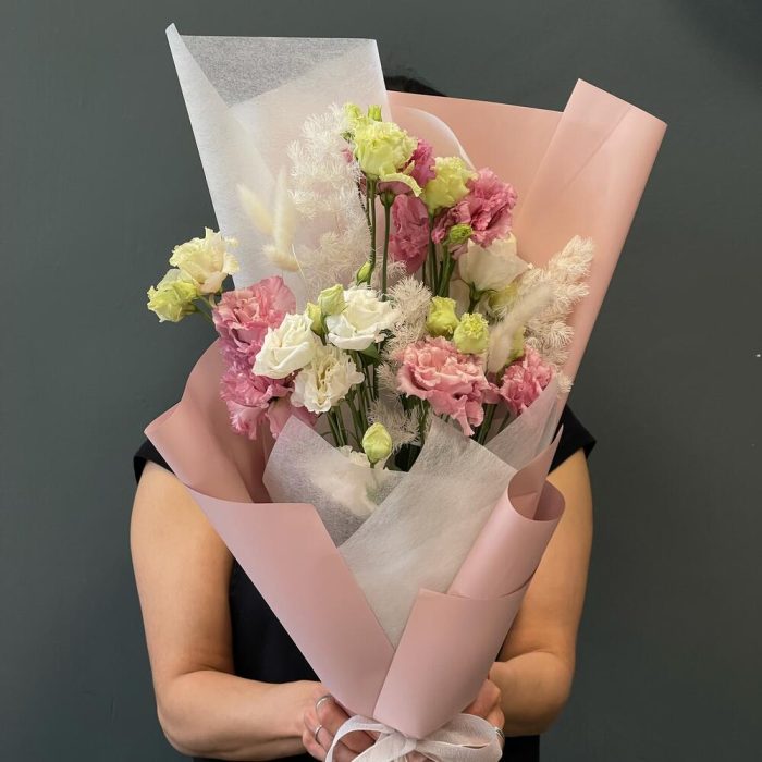 Букет из белых и розовых лизиантусов и сухоцветов “Нежное кружево”