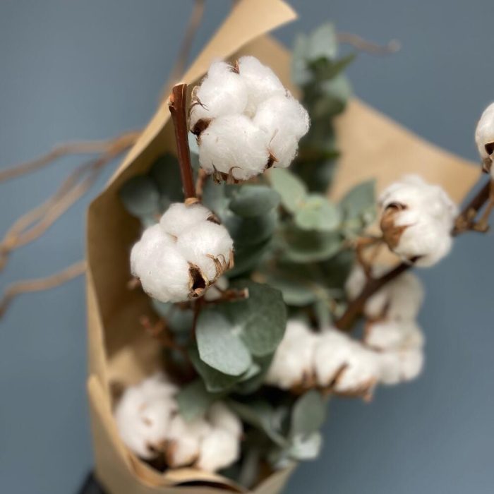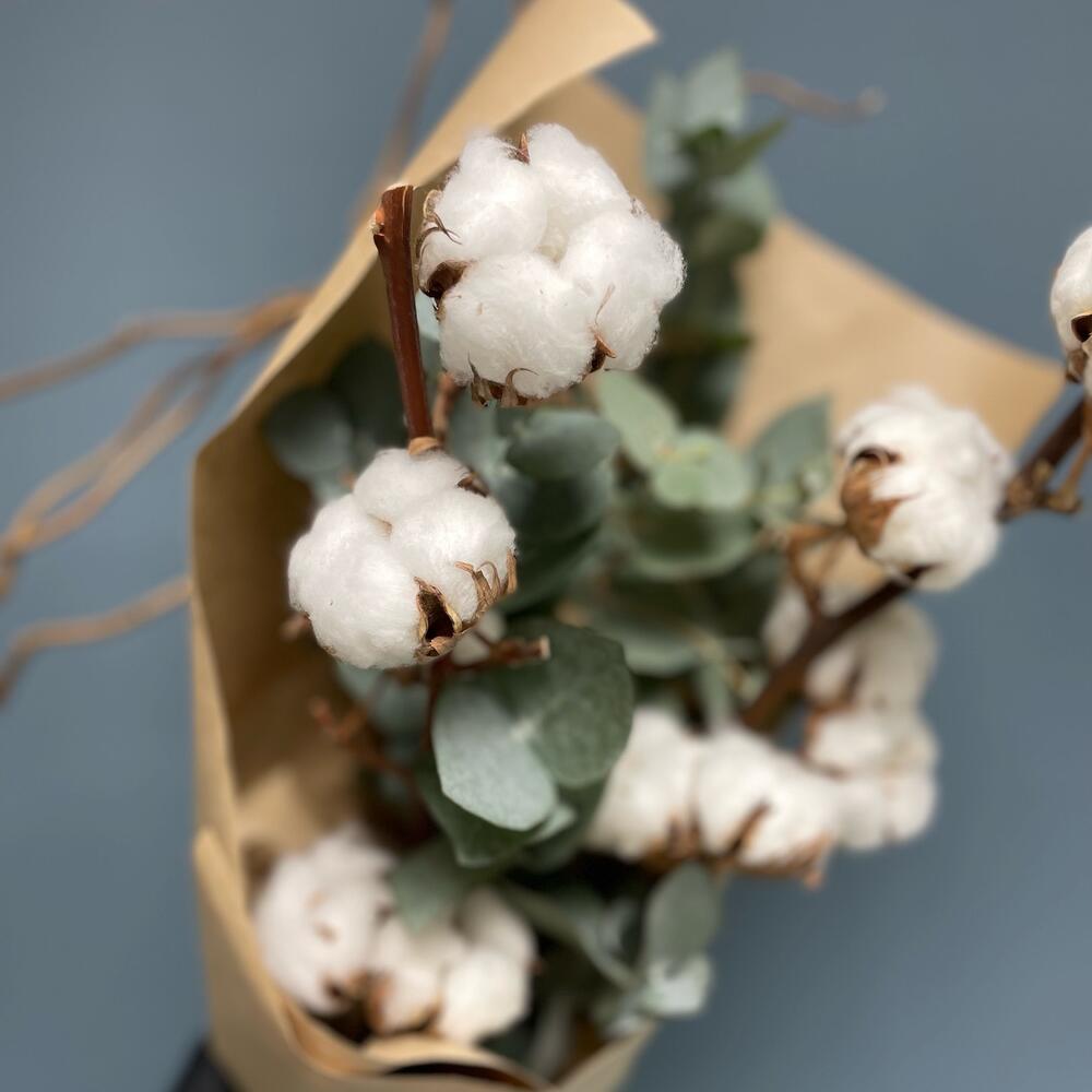 Хлопок (сухоцвет) – 2 шт.Эвкалипт – 4 шт.Упаковка дизайнерская – 1 шт.