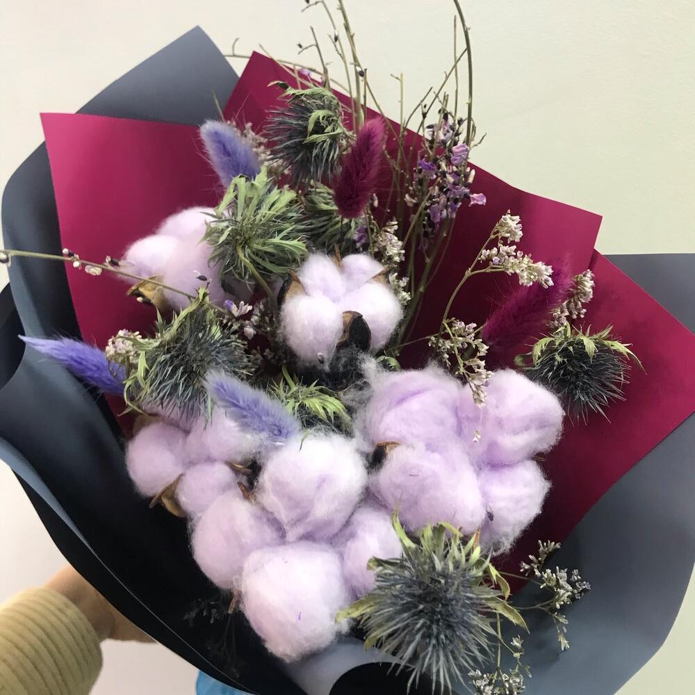 Хлопок – 5 шт.Чертополох – 7 шт.Лагурус – 4 шт.Лимониум – 1 шт.Авторская упаковка – 1 шт.Открыточка с вашими пожеланиями – 1 шт.