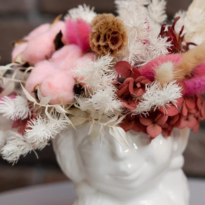 Хлопок натуральный – 2 шт.Скабиоза – 3 шт.Лагурус (сухоцвет) – 15 шт.аспарагус стабилизированный – 4 шт.гортензия стабилизированная – 1 шт.пальма сухоцвет – 1 шт.Кашпо керамическое – 1 шт.